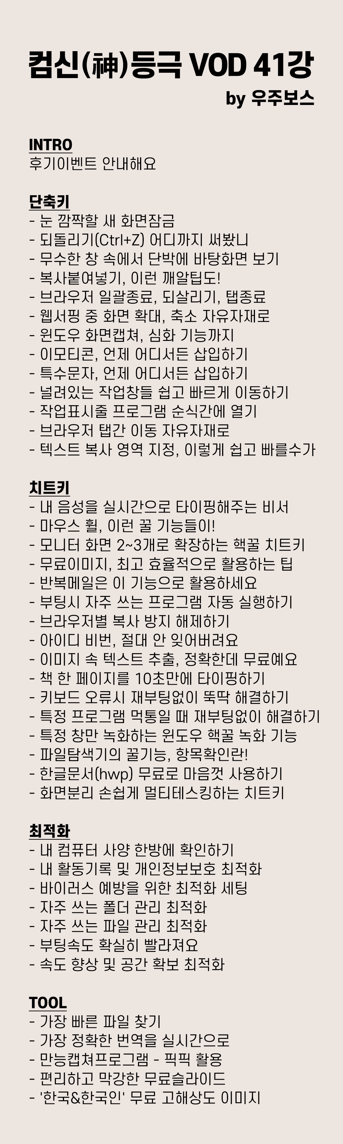 컴맹 탈출하고 컴신 등극하는 컴퓨터 치트키, 단축키, 활용팁 등 VOD 40강입니다.